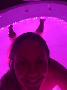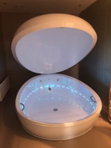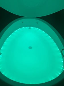 Once the pod was ready for me, a gentle music played and soft lighting illuminated the pod for five minutes, before total darkness. This gave me time to turn the room lights off and slowly submerge my naked self into the tub, pulling the lid down as I lay down. I couldn’t believe that I was floating; I was certain that my rotund bottom was going to pull my body down, leaving me resting on the bottom of a giant bathtub! But nope, once I stretched out, my body was held and buoyant, floating on the water; I felt weightless.