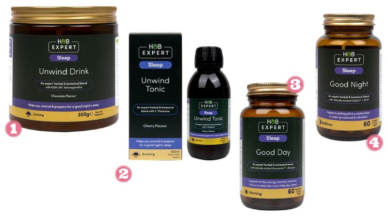 Developed by experts, the H&B Expert Sleep range is the perfect solution if you need to take back control of your sleep routine naturally. The range includes four products – Unwind Drink (1), Unwind Tonic (2), Good Day (3) and Good Night (4) – which you can either use together or alone depending on your sleep needs.
