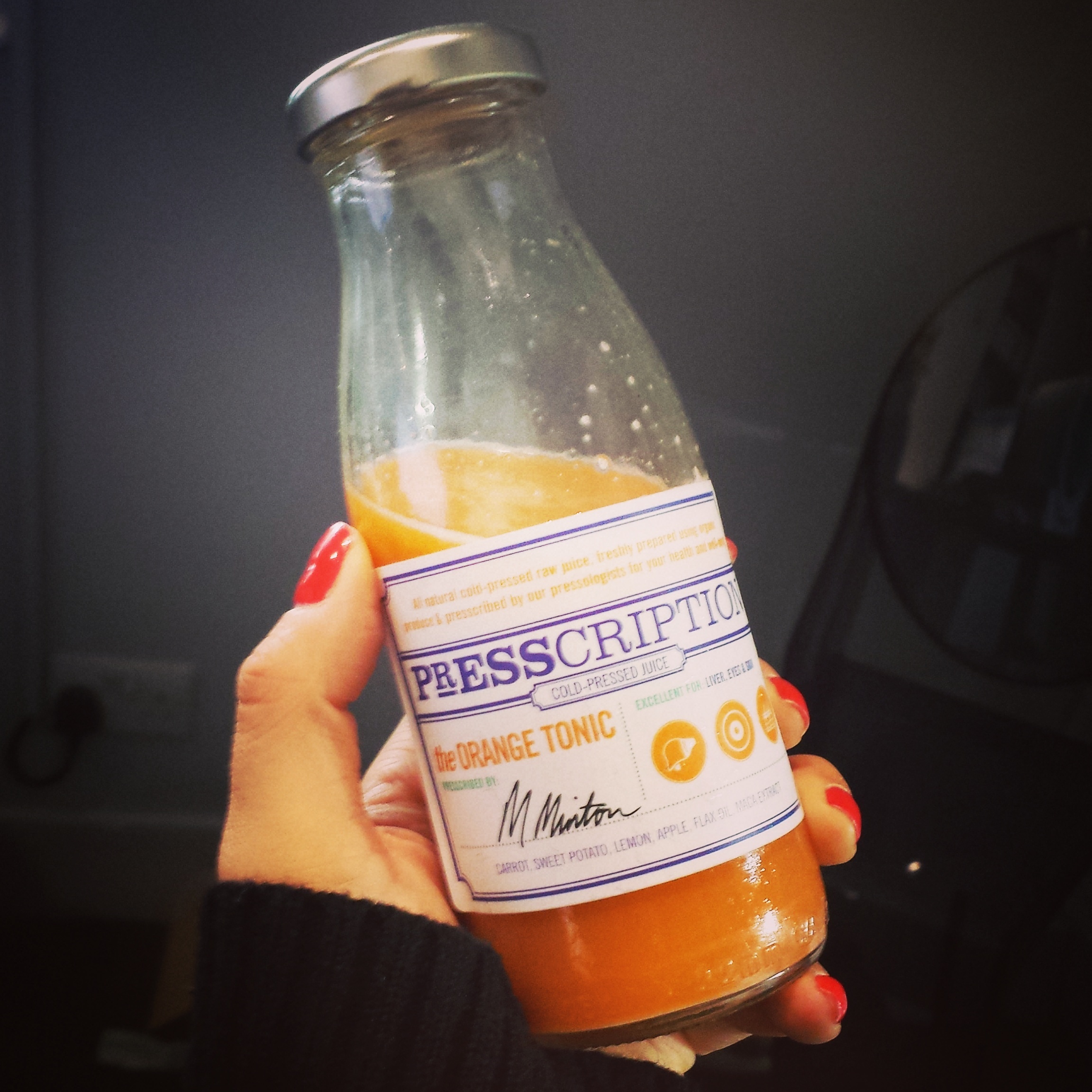 I love the approach that Presscription takes to juices, the little images on the bottle which clearly lay out where your body benefits from each particular juice and their website is a very thourough source of info as to why their juices are good for you. Even more specific and impressive is a breakdown on why their Norwalk ‘Rolls Royce’ of centrifugal juicers are such a superior method of producing fabulous juice. I have to say I have always noticed that I have liked the juices produced by this particular piece of machinery and now I understand a lot more clearly why . Take carrots as an example – a normal centrifugal juicer will get 501mgs of calcium out of said carrots, rather than a huge 2708mgs with the Norwalk! Anyway – I feel the Presscription juices are well thought and good quality. The Orange Tonic was certainly unusual – it contains sweet potato! I enjoyed having something so different although may not be a flavour to suit everyone. I love a morning wake-me-up-and-start-the-day-right kind of juice so their Green Revive is perfect for that – a good spicy kick start but tasty as well.