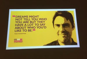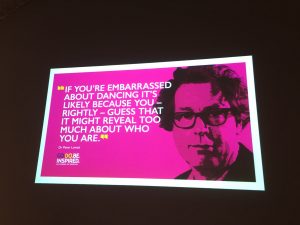 Dr Peter Lovatt discussed the relationship between movement and the mind. Bearing in mind there are hundreds of possibilities in most situations, getting up and moving helps us to think, especially if you are blocked. (He got us all on our feet dancing!)