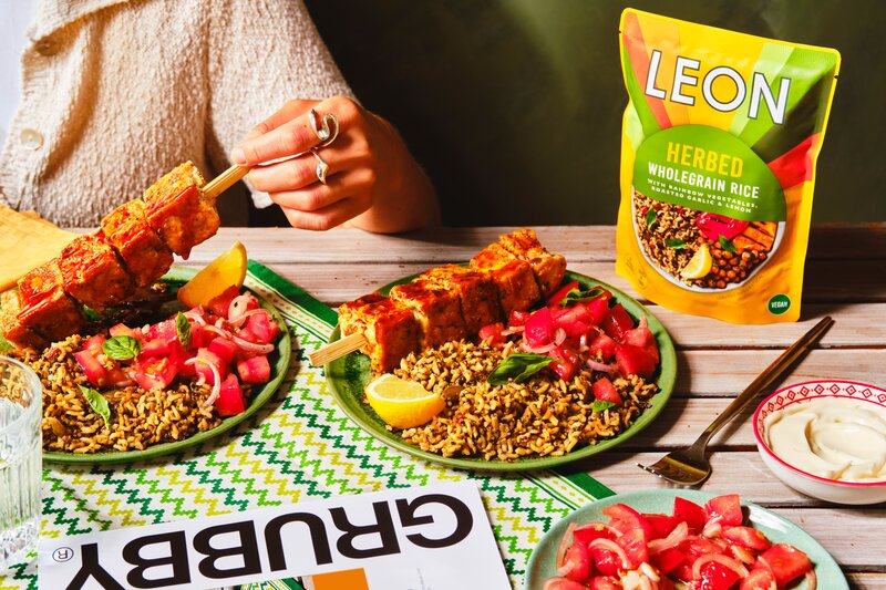 LEON Crispy Tofu Souvlaki Skewers with Mediterranean Rice